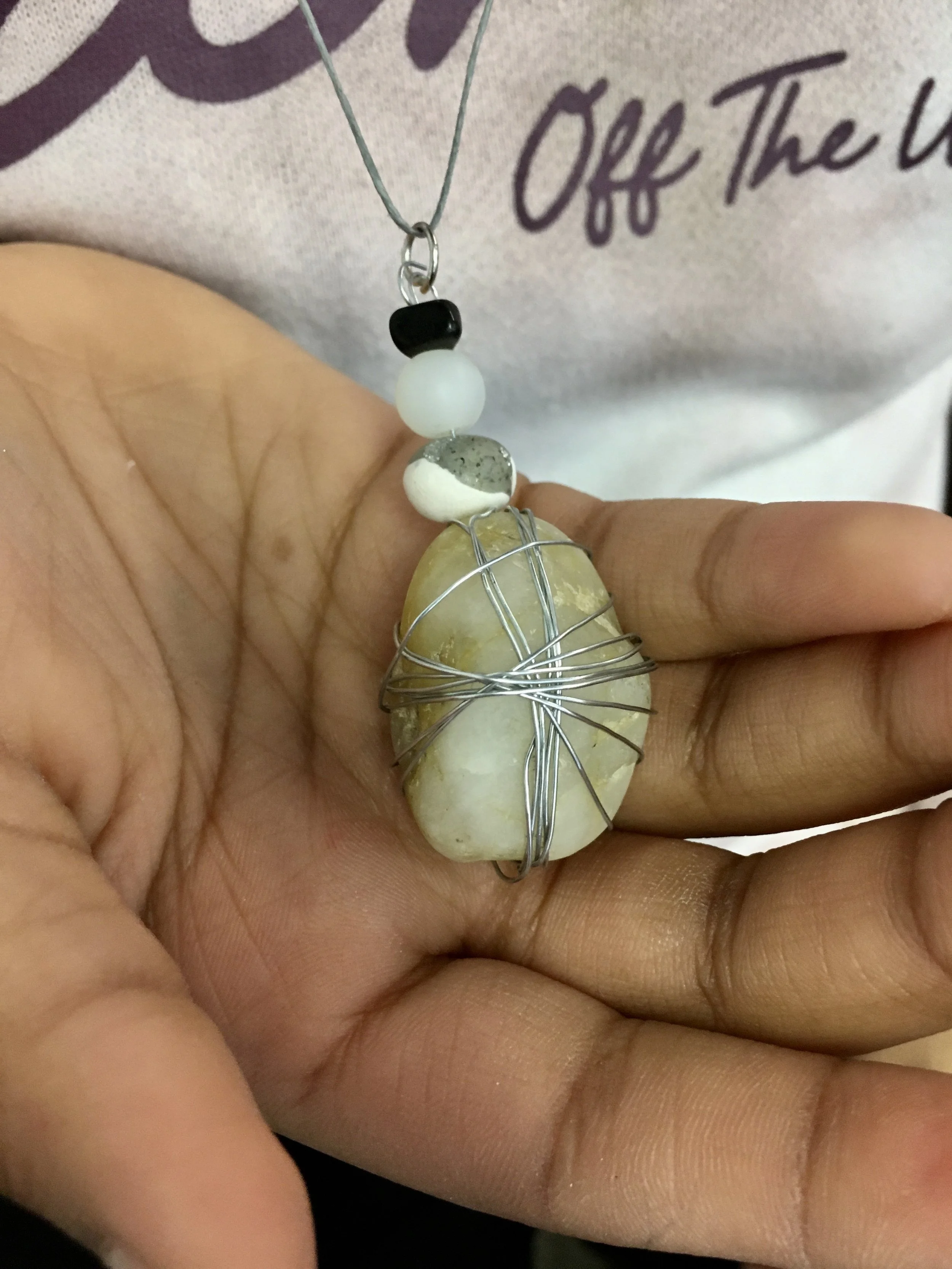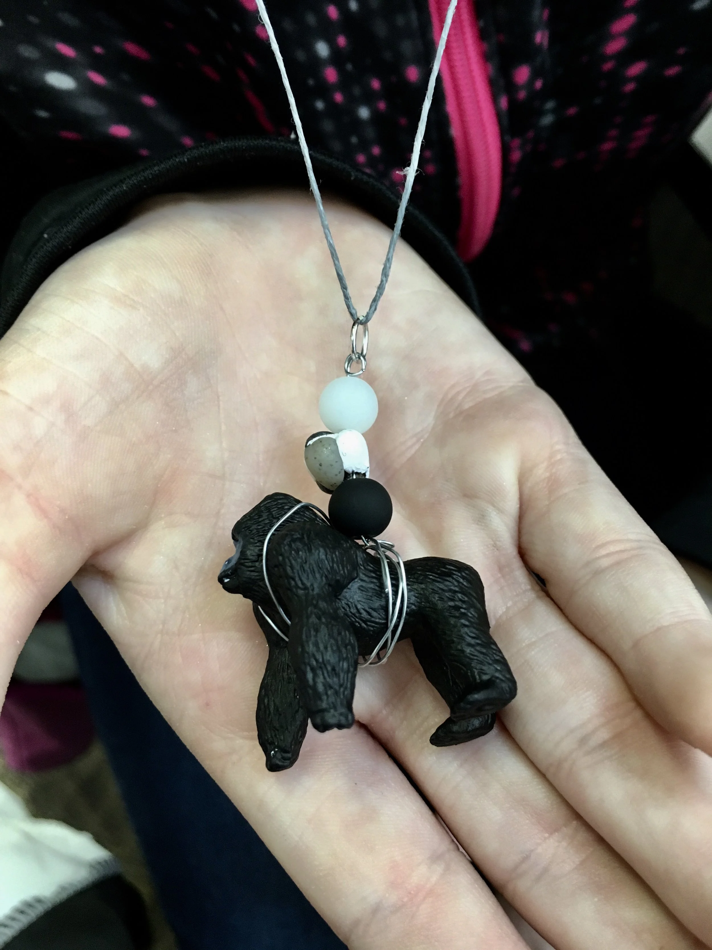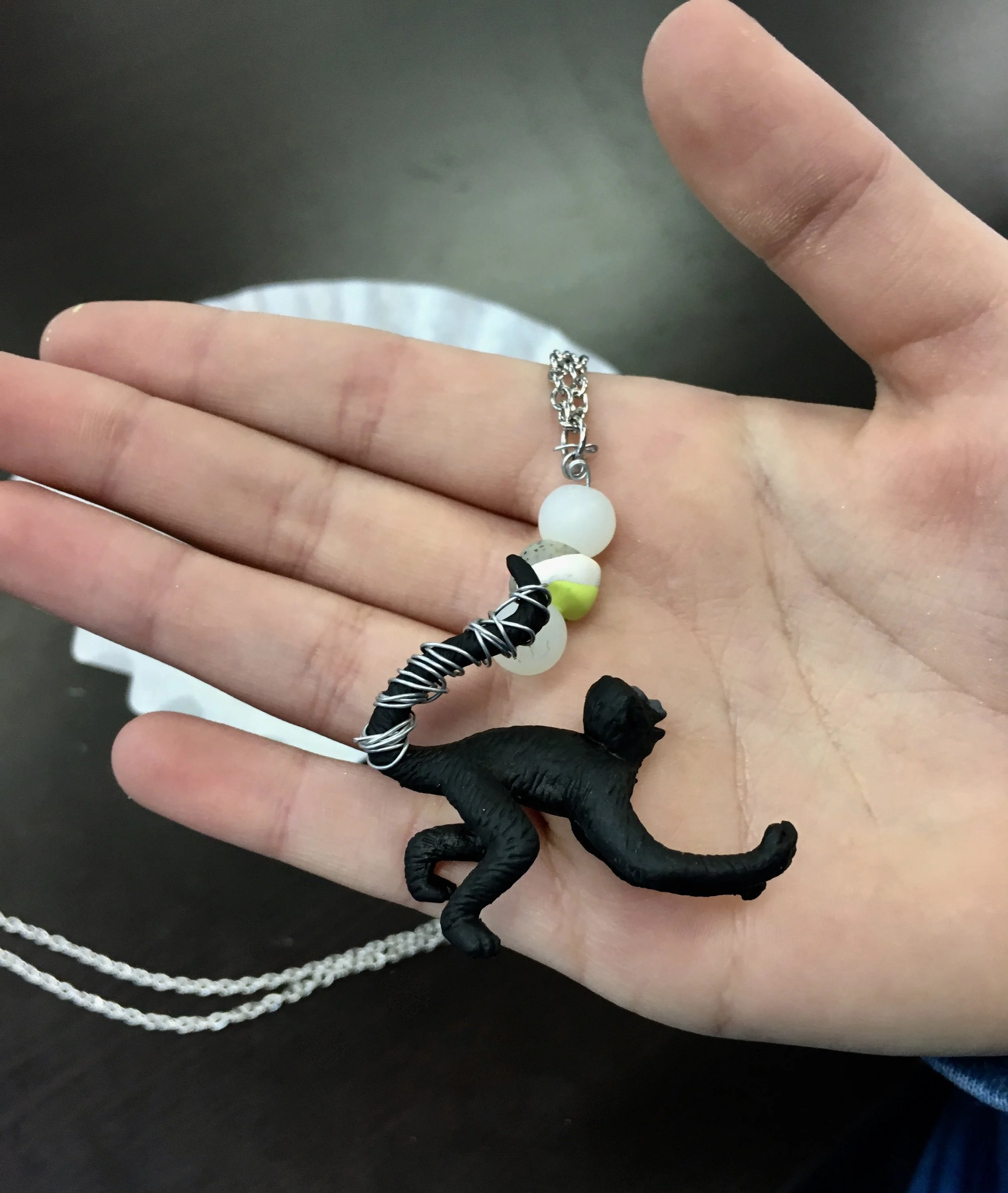 We started the workshop picking a wild animal or rock to use as the focal point for our necklaces. We then picked different colors of sculpey to coordinate with our rock or animal. The girls learned how to make “marbled” beads with the different colors of sculpey. We wrapped our rocks and animals with thin wire to hold them secure. The girls picked one of their favorite beads along with some others to add to their necklaces. Each girl got to use real tools of the trade (cutters, flat and round nose pliers) to finish off their necklaces adding jump rings and clasps.