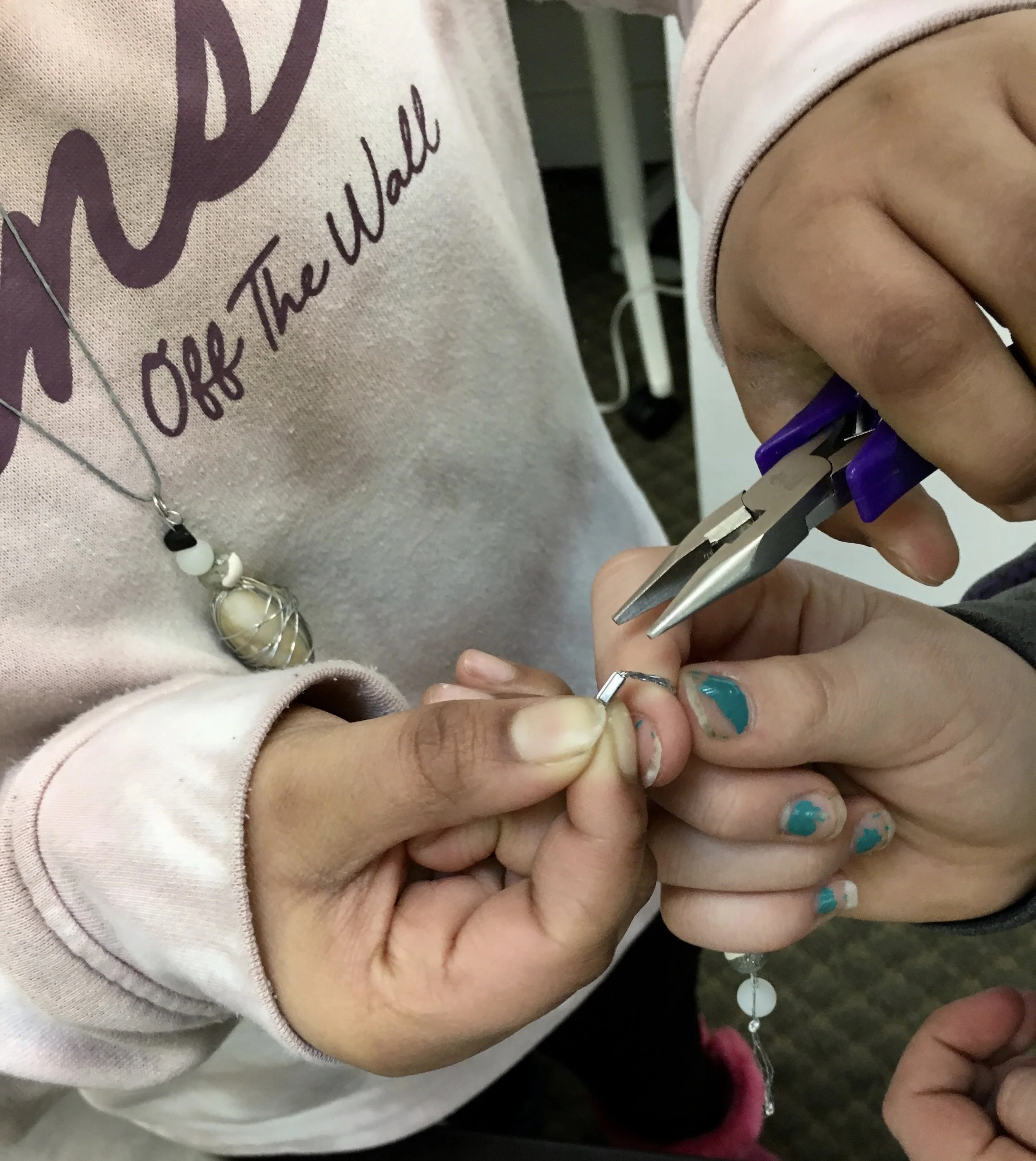 After necklaces each girl got to create a couple different friendship bracelets while putting their new plier skills to use adding crimp cord ends to make them look more polished.
